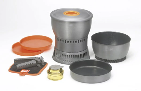 Ein reichhaltig ausgestattetes Kocherset für den Betrieb mit Spiritus. Innovativ in dieser Klasse ist der Wärmetauscher an den Töpfen, der hilft, den Brennstoff effektiver zu nutzen.