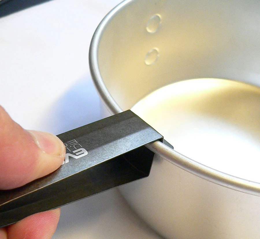 Der Federstahl ist beschichtet, dadurch auch schonend zum Material der Töpfe/Kochbecher.