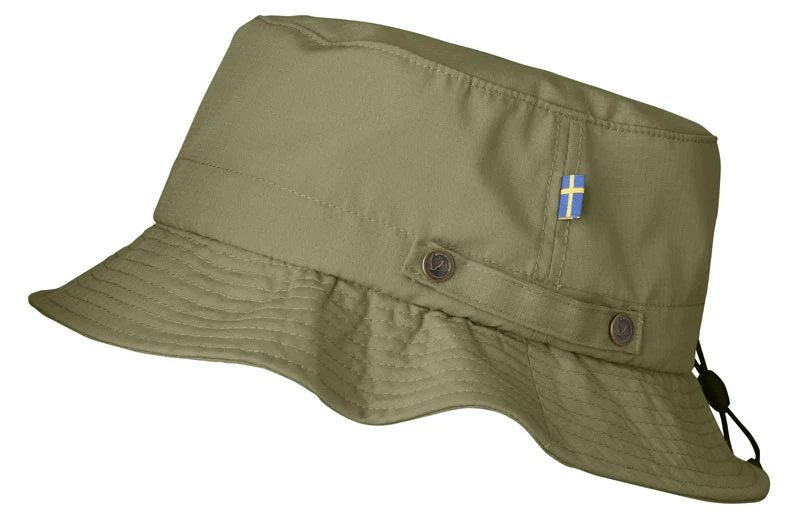 Mit einer Druckknopf Sicherung kann man den zusammengefalteten Hut in ein festes Päckchen verwandeln, diese Sicherung lässt sich aber sicherlich genauso gut als Anhängemöglichkeit an Rucksack o.ä. nutzen.