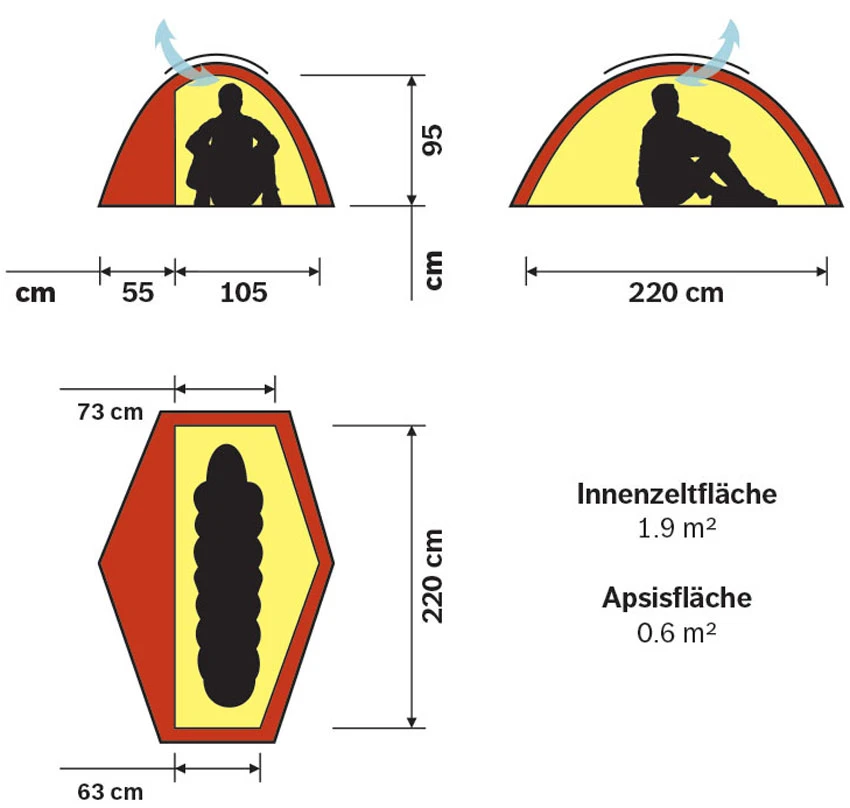 - Innenzelt und Aussenzelt sind gekoppelt, gut für schnellen und wettergeschützten Auf- und Abbau
