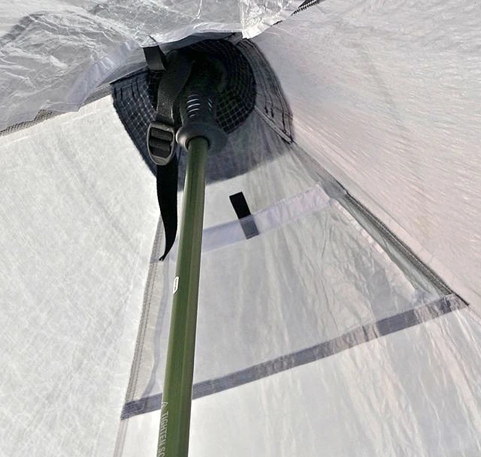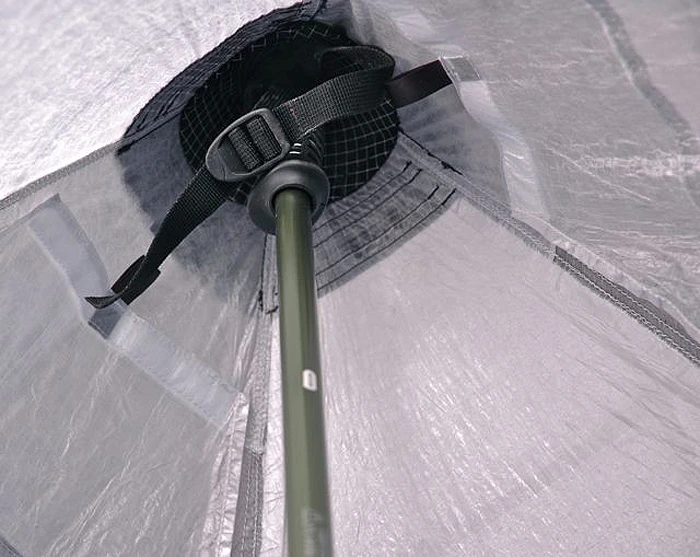 Pyramidenzelte haben gewöhnlich keinen Boden, UltaMid auch nicht. Ein Nebennutzen dieser Konstruktion ist die Möglichkeit, das Zelt je nach Witterung und gewünschter Ventilation höher oder tiefer abzuspannen. Und im Winter Sitzgräben zu nutzen…