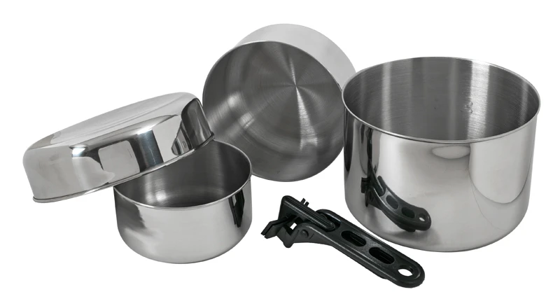Das grosse Edelstahl Kochset für Familien, Gruppen oder die größere Outdoor-Küche. Ausreichend für 4 Personen. Komplett mit Griffzange.