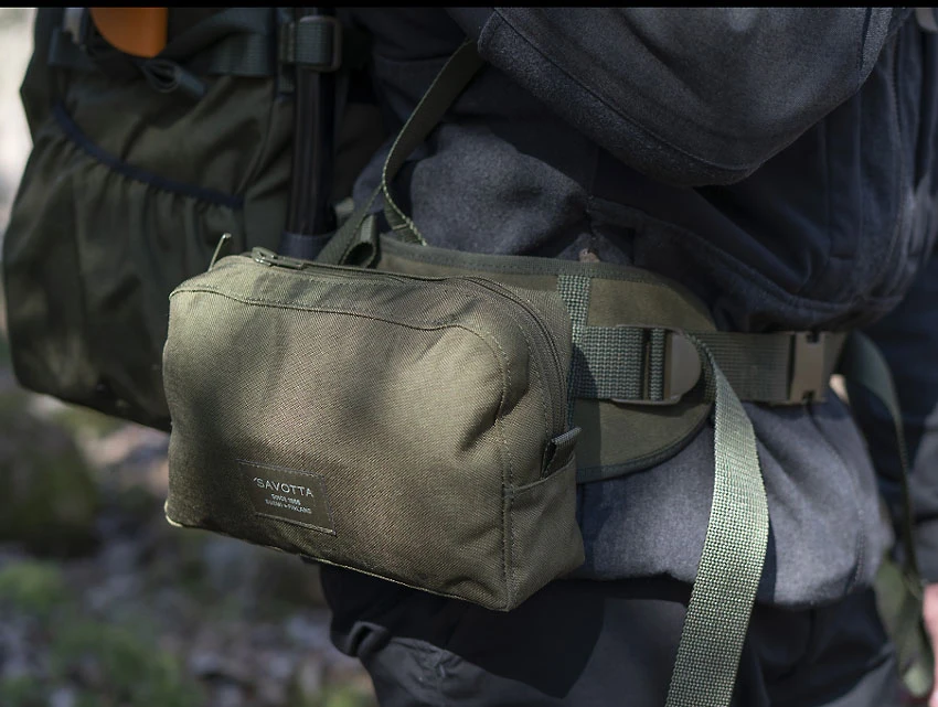 Eine Zubehör-Tasche im Horizontal-Schnitt. Kann auf Gürteln separat getragen werden, passt mit dem PALS-Befestigungssystem auch auf breitere Rucksäcke mit diesem System -vorne, oben, oder bei entsprechender Tiefe auch an die Seite.