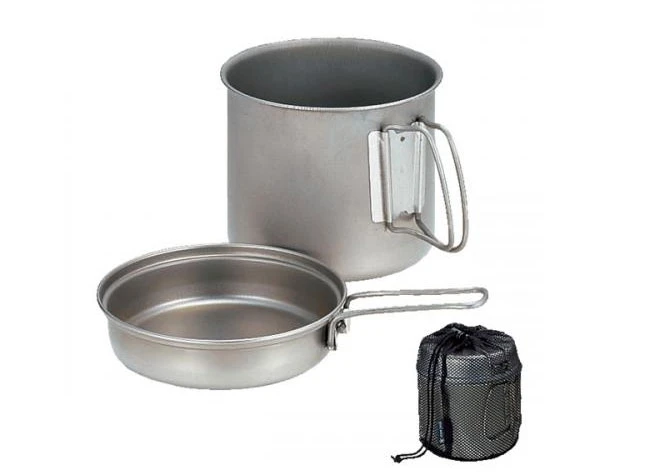 Für alle Ultraleicht-Backpacker: Ultraleichter Titantopf mit eingestanzter Skala und Klappgriffen sowie Titanpfanne mit arretierendem Klappgriff.