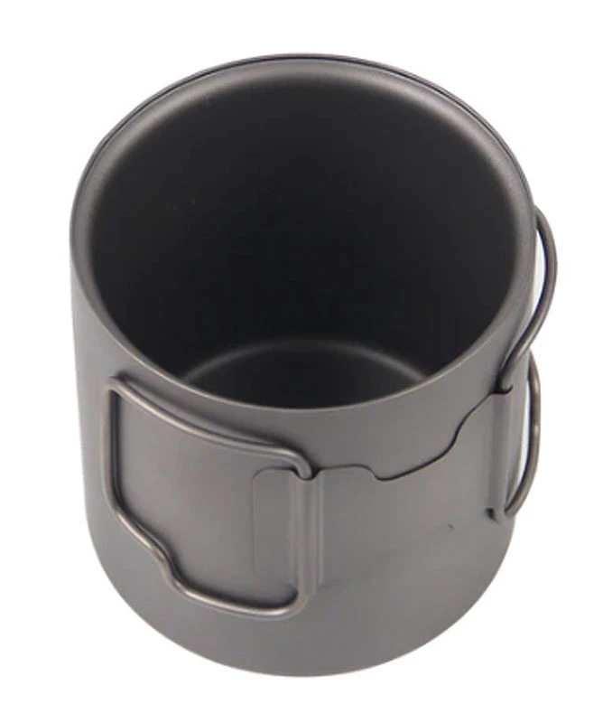 Ein Titan-Becher mit 370 ml max Volumen, doppelwandig und daher den Inhalt länger heiss oder kalt haltend. Faltgriffe lassen den Becher leicht greifen und halten, das Packmaß bleibt aber klein.